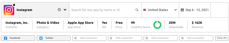 You may also add up to five competitors. To do this, click on an empty competitor slot in the header, and search for the app by name and click on the correct search result.